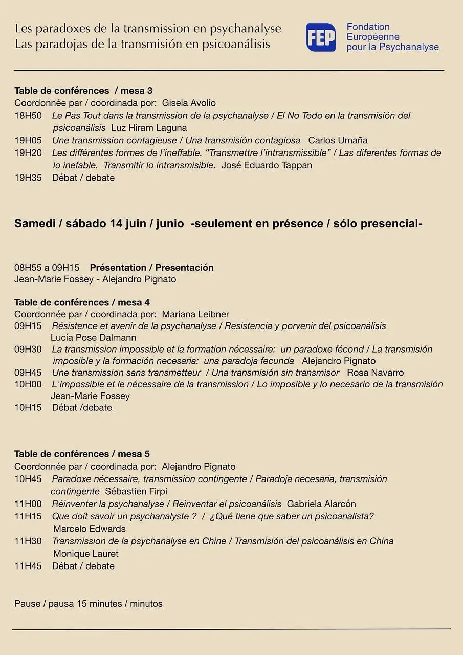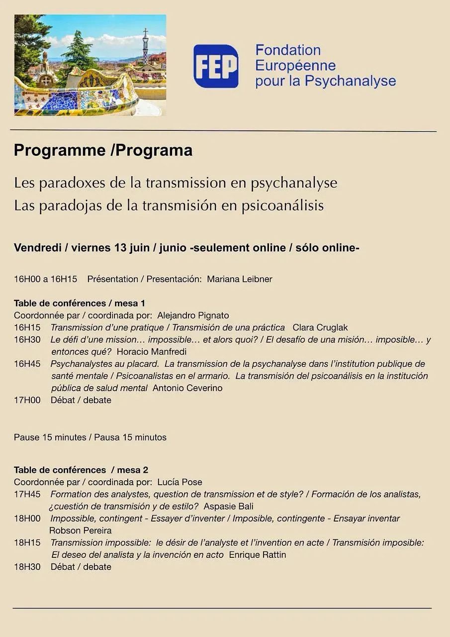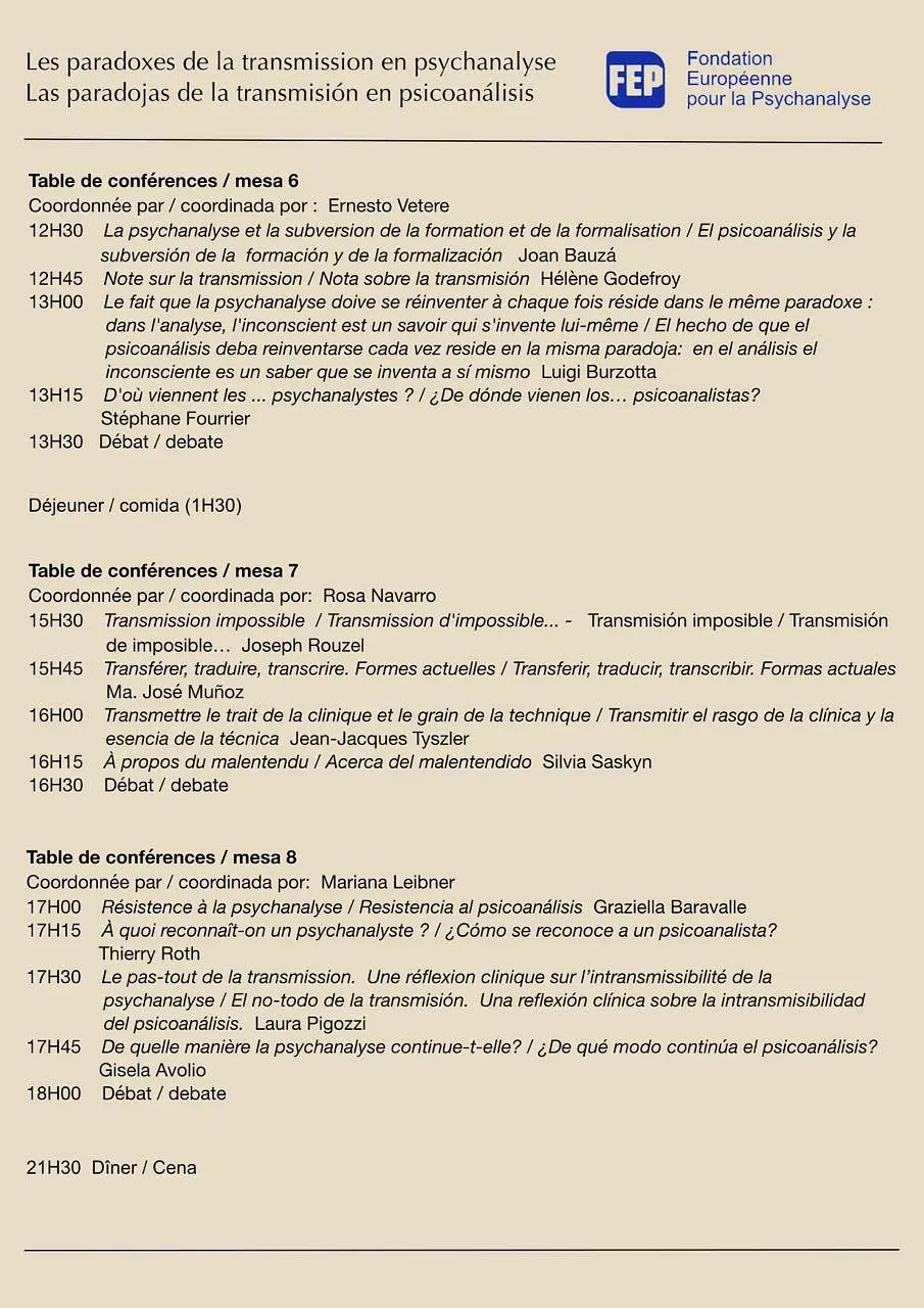 Asumir el reto de la imposible transmisión, auténtico obstáculo en resonancia con la subjetividad de nuestra época, es la apuesta que la Fondation Européenne pour la Psychanalyse propone a colegas de Europa y de otros países. Este coloquio será también la ocasión de repensar lo imposible y lo necesario en la formación del psicoanalista y de intentar, de manera indirecta, circunscribir lo inaudito de la experiencia analítica, profundamente arraigada en la transferencia y en la palabra del paciente; un espacio, por tanto, de inventiva, donde el acto analítico se redefine sin cesar, modelado por la singularidad de cada sujeto y de cada situación transferencial.